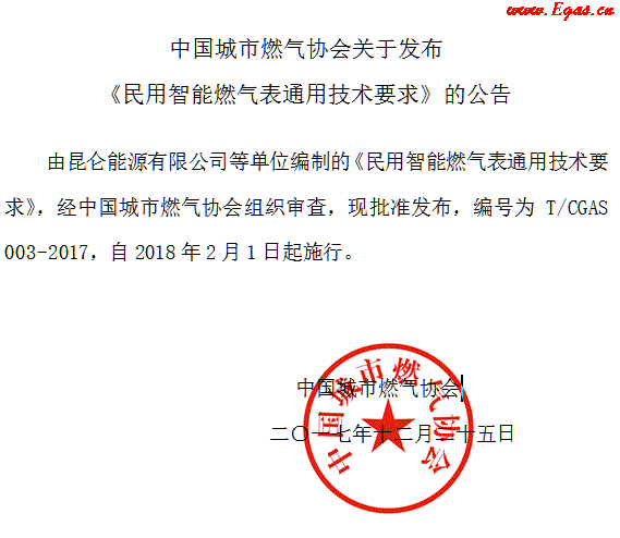 為了規(guī)范和統(tǒng)一民用智能燃?xì)獗淼慕Y(jié)構(gòu)、功能、技術(shù)要求以及設(shè)計(jì)、生產(chǎn)、檢驗(yàn)和維護(hù)環(huán)節(jié),便于燃?xì)馄髽I(yè)的運(yùn)行管理,由中國城市燃?xì)鈪f(xié)會(huì)組織,由昆侖能源有限公司擔(dān)任主編編制了中國城市燃?xì)鈪f(xié)會(huì)標(biāo)準(zhǔn)《民用智能燃?xì)獗硗ㄓ眉夹g(shù)要求》T/CGAS003-2017自2018年2月1日開始實(shí)施