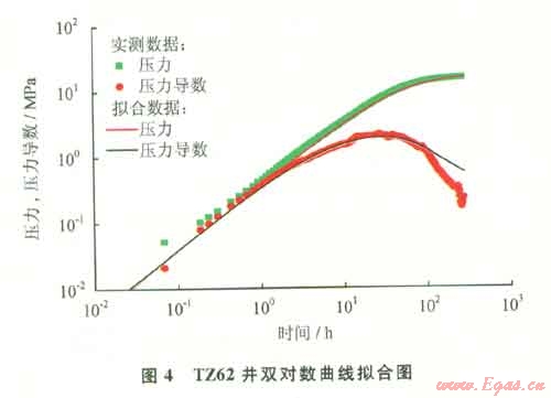 如TZ62井,4704.5~4753.5m井段儲(chǔ)層的沉積環(huán)境主要為砂屑灘、層孔蟲(chóng)一海綿骨架礁,沉積微相為中高能砂礫屑灘、礁頂一礁坪、礁翼一礁核。巖性主要為淺灰色隱藻泥晶灰?guī)r、泥亮晶生屑砂礫屑灰?guī)r、珊瑚格架灰?guī)r,發(fā)育溶蝕孔洞及高角度裂縫,裂縫被方解石充填。孔隙度介于1.84%~6.2%,Ⅰ、Ⅱ、Ⅲ類(lèi)儲(chǔ)層均有發(fā)育。該井從2004年3月23日開(kāi)始一直進(jìn)行試采,酸壓改造后投產(chǎn),雙對(duì)數(shù)曲線(xiàn)顯示出明顯的串珠狀特征(圖4)。截至2009年1月5日關(guān)井前,累計(jì)產(chǎn)油1.4×104t,累計(jì)產(chǎn)氣3125×104m3,呈現(xiàn)出階梯穩(wěn)產(chǎn)特征。